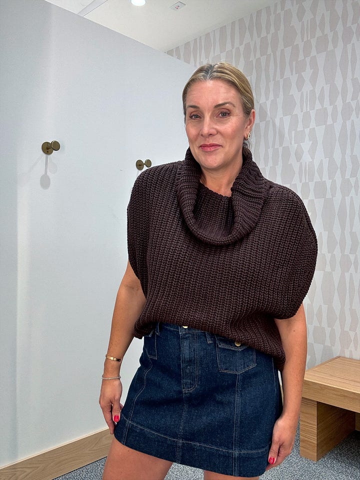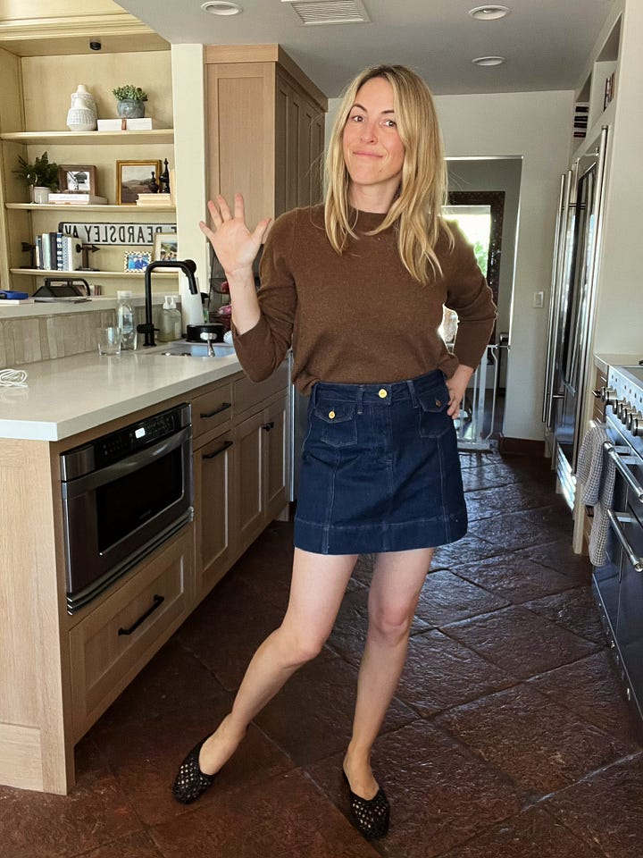 Laura jumped on the mini denim skirt trend that Allison fell for a few weeks ago during our Evereve try. We have tried others since, like this less expensive option from Madewell and love the look. It’s great with an elevated blouse, thinner sweater, chunky sweater or a simple tee. Looks great with flats, boots or tennies for a more casual look. Shop the mini here.